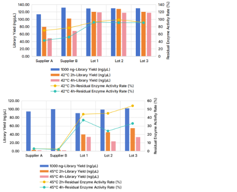 将翌圣生物三批次Premium T4 DNA Ligase与供应商A和B的T4 DNA连接酶进行42℃和45℃下0、2 、4 h的热处理。接着,使用翌圣生物DNA建库试剂盒(Cat#12927ES),投入1 µg断裂的牛gDNA构建全基因组DNA库, 以此比较T4 DNA 连接酶的热稳定性。