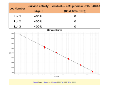 使用翌圣E.coli宿主细胞DNA残留检测试剂盒(2G)(Cat#41318)对3批次的Premium T4 DNA Ligase进行宿主(E.coli)gDNA残留检测。