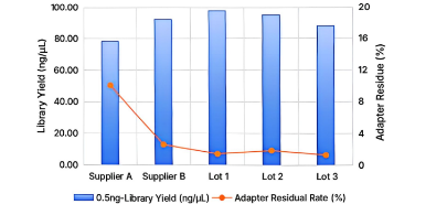 将翌圣三批次Premium T4 DNA Ligase与供应商A和B的T4 DNA连接酶进行接头自连对比测试,使用翌圣DNA建库试剂盒(Cat#12927ES),投入0.5 ng断裂的牛gDNA来构建全基因组DNA文库。